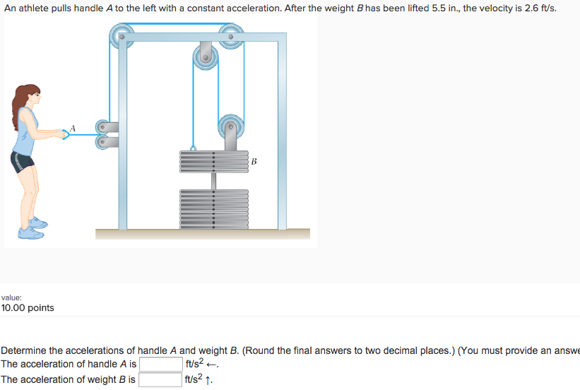 Solved An Athlete Pulls Handle A To The Left With A Constant Acceleration Knowing That After The Weight B Has Been Lifted 4 In Its Velocity Is 2 Mathrm Ft Mathrm S Determine A
