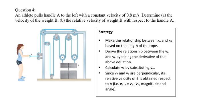 An athlete pulls handle A to the left with a constant velocity of 05 ms. 8 marks b the relative velocity of weight B with respect to the handle A. An athlete pulls handle A to the left with a constant acceleration.